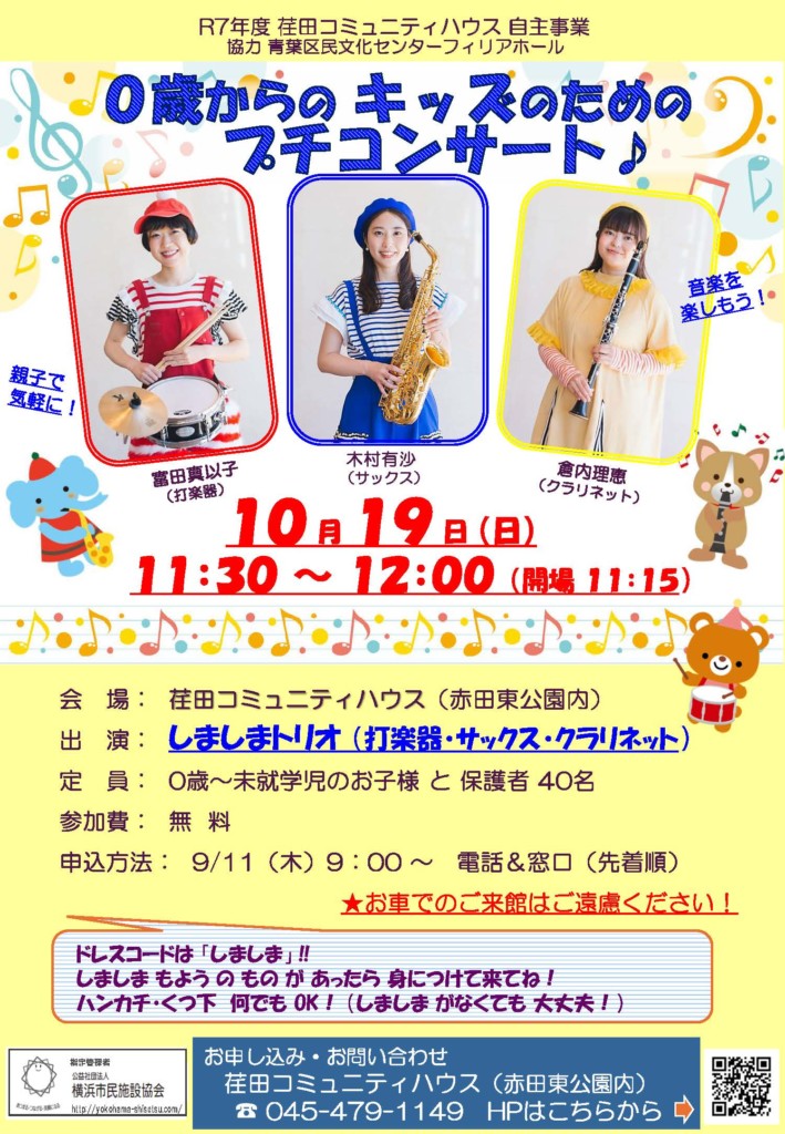 | 出演 | しましまのおんがくたい 倉内理恵(クラリネット) 木村有沙(サックス) 富田真以子(打楽器) |